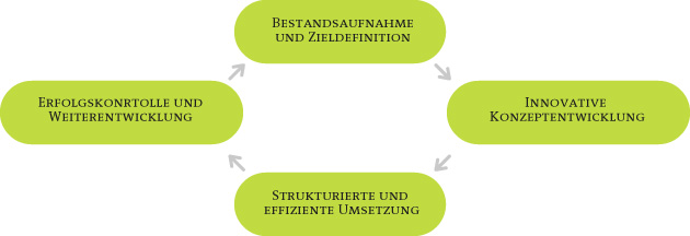 In der Konzeption wurden die grundlegenden Weichen gestellt, um Potenziale ausschöpfen und Ressourcen optimieren zu können. Nun erarbeiten wir gemeinsam mit Ihnen effektive und nötige Strukturen sowie effiziente Prozesse, die eine erfolgreiche Umsetzung möglich machen.
